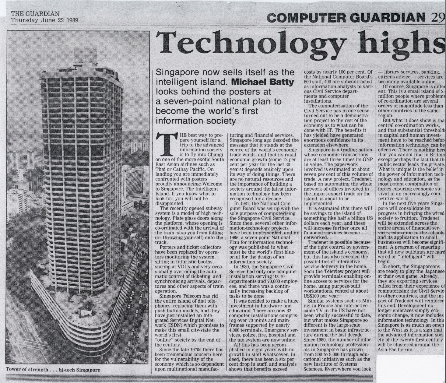 Smart Cities go back a long way. I visited Singapore in May 1989 and it then badged itself as The Intelligent Island. I wrote an article on what was happening back then as they began to wire the island and move government and commercial services ‘online’ using ISDN & related networks. Click for Guardian article. More photos from back then soon.